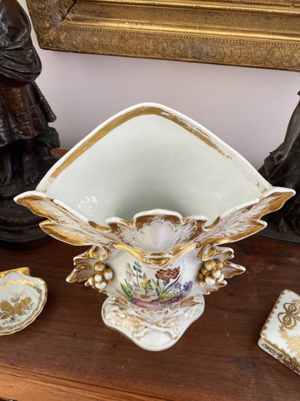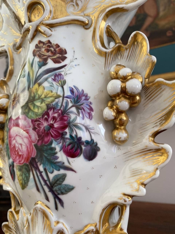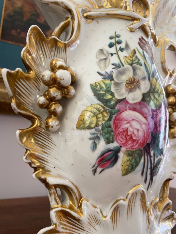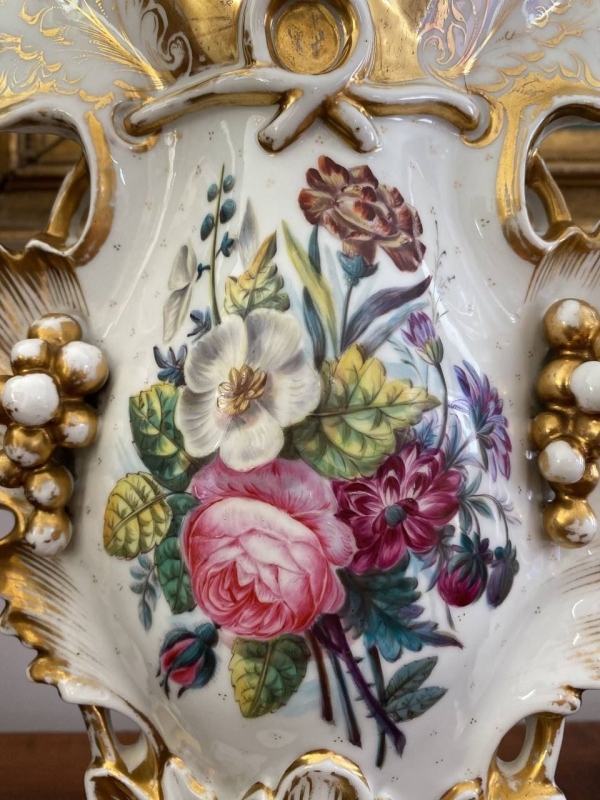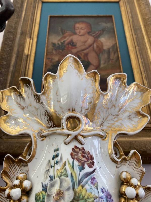 This exquisite 19th-century French porcelain wedding vase is a masterpiece of craftsmanship and tradition. Originally gifted to brides to preserve their wedding bouquets under glass, this vase embodies the romantic heritage of Old Paris. Hand-painted with real gold accents, it features delicate floral designs and grape clusters on both sides, showcasing the artistry of Parisian porcelain.